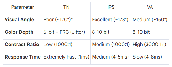 *Note: While TN may cite a wider raw degree spec than some VA panels in specific manufacturer tests, TN is significantly more prone to vertical color inversion.